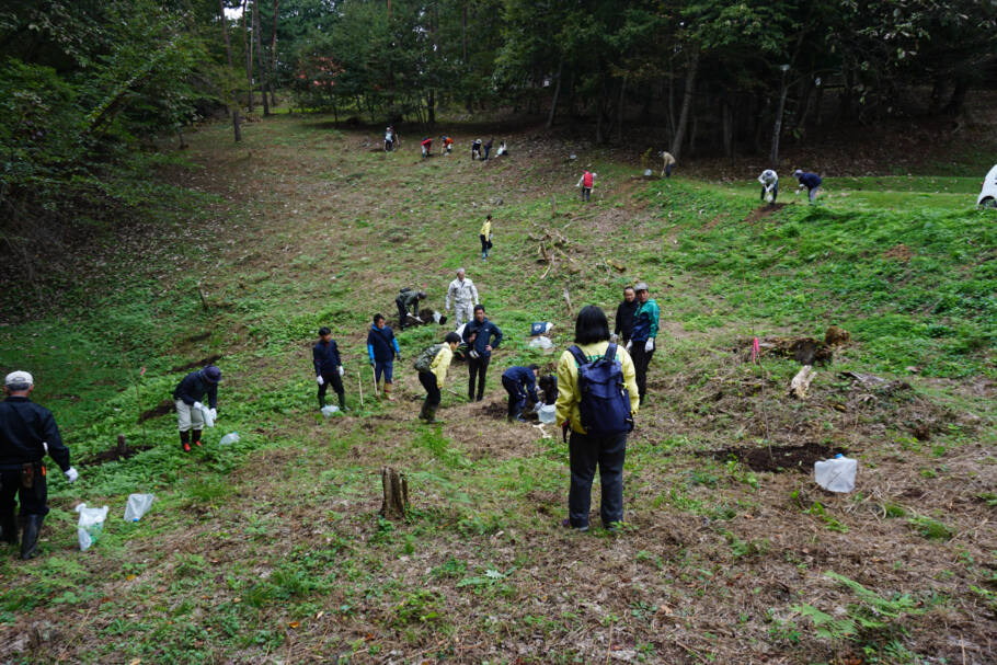 10月11日(土)北上市で、第15回いわての森林の感謝祭を開催しました。林業関係者、地元の小学生、緑の少年団、一般参加者など約300人が参加しました。展勝地レストハウス前の屋外ステージで式典を行った後、記念植樹と標柱建立が行われました。岩手県知事、北上市長らが、町内の小中学生と一緒にエドヒガンを記念植樹しました。県の間伐推進キャラクターの「カンバツ君」、わんこきょうだいの「そばっち」も登場し会場を盛り上げました。その後の一般植樹では、会場を憩いの森に移し、4種類のモミジを植樹しました。来年は、久慈市で開催が予定されています。